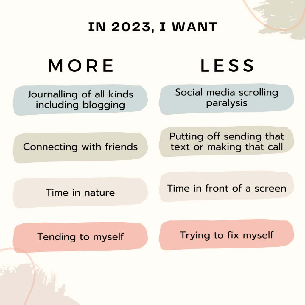 I want a more reflective year with time to think about what is happening in my life for longer than the usual January blogging spurt. I also want to stop wasting hours stuck in a state of paralysis scrolling on Instagram – when I heard the term ‘scrolling paralysis’ I had a serious a-ha moment: that is exactly what it feels like! It feels like I can’t stop like I am stuck and despite knowing I am tired, or too busy for such nonsense, I find myself unable to Put The Phone Down. I have set up my screen time reminders again which has helped but I need to do even better in 2023.
